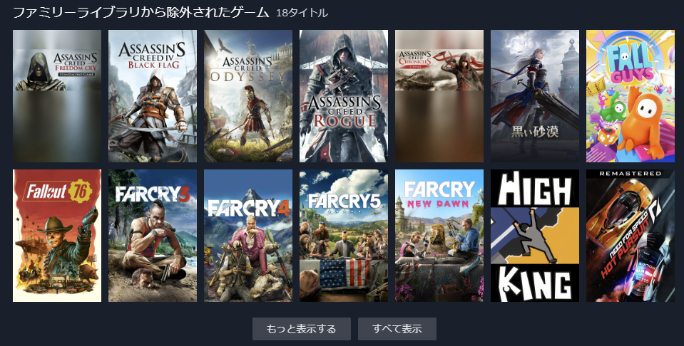 ファミリーライブラリから除外されたゲームも見られるようになっていました。ほぼUbisoftでした。サードパーティーのキーが必要など技術的理由があるようです。