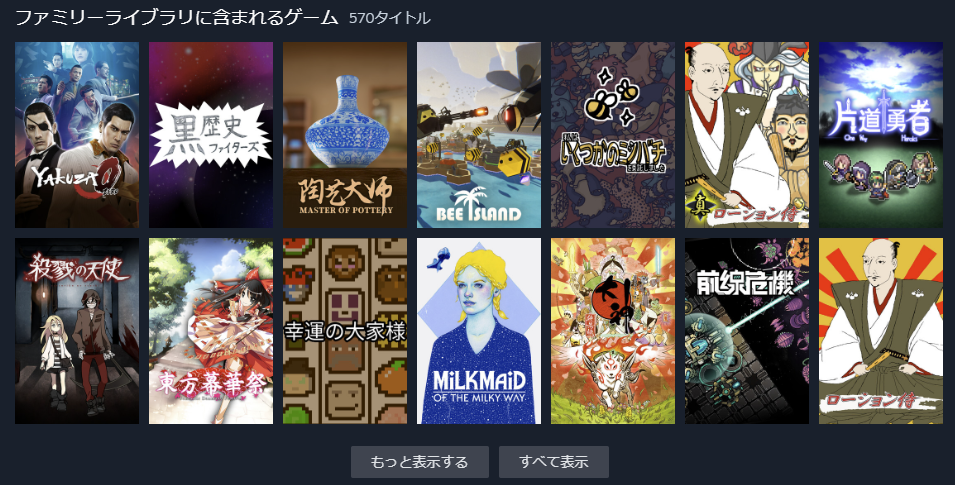 ゲームのシェアと言うより、ライブラリをシェアしている感覚です。すごい機能です。大丈夫なのか心配になるレベルです。家族のアカウントの方は作ったばかりで全然ゲームを持っていませんでしたが、この機能のおかげで急に570タイトルで遊び放題になってしまいました。もちろん一方的ではなく、家族がシェアリング対応ゲームを買ったらここに追加され、私も遊べるようになることでしょう。