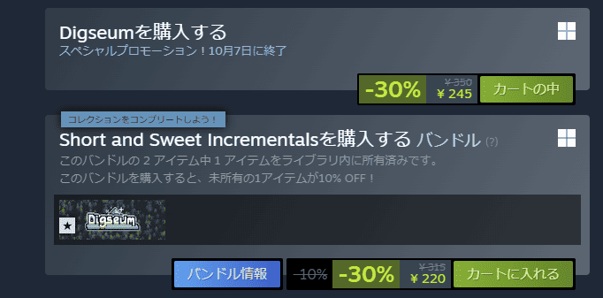 場合によってはバンドルのほうが安いので、ウィッシュリストから直接買う前にストアページを確認するといいです。バンドル購入は新しい出会いもあるのでおすすめです。