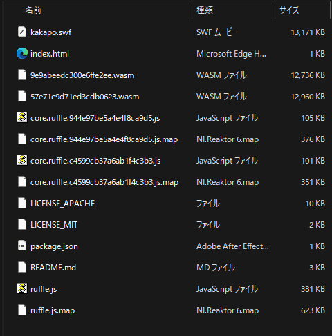 kakapo.swfとindex.html以外は全てRuffleのファイルです。