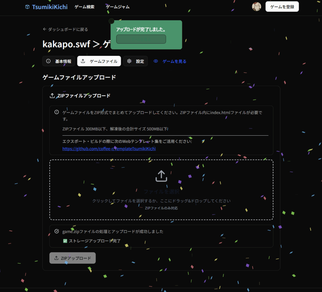 zipファイルのアップロード中は積み木が落ちてきて、完了すると紙吹雪が舞いました。テンションぶち上げ。