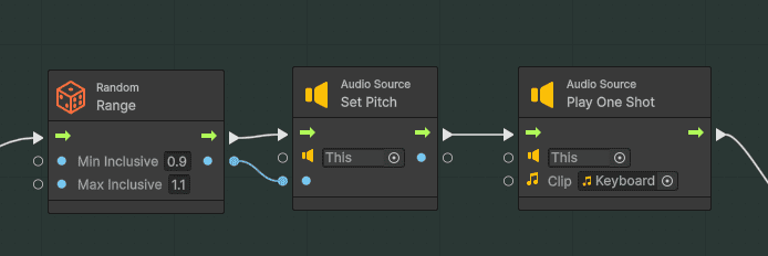 Range(Random)で、任意の範囲内でランダムな数値を出すことができます。この例では0.9~1.1の範囲で数値が変動し、それをSet Pitchにつなげてピッチ(音の高さ)を変更しています。その後Play One Shotで効果音が鳴ることで、効果音に若干のランダム性をもたせることができます。ピッチを戻すには1をセットし直します。ピッチの範囲をいろいろ試してみるのも面白いかもしれません。(このグラフの例では、あらかじめ同じゲームオブジェクトにAudio Sourceを追加しています。)