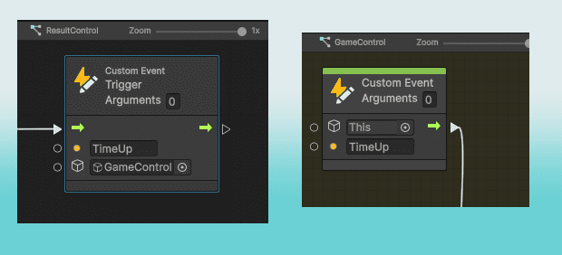 Custom EventのTriggerで、別のグラフやイベントを動作させることができます。受け取る方のグラフを含むGameObjectを指定し、イベント名(ここではTimeUp)を書き込みます。受け取るグラフの方では、Custom Eventのノードで同じイベント名を入力します。